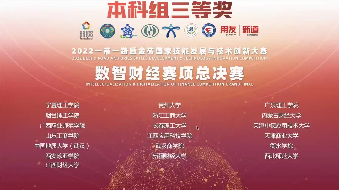 2022年10月30日,mk体育组织代表队参加了“2022一带一路暨金砖国家技能发展与技术创新大赛之数智财经赛项”全国比赛,荣获全国三等奖。
